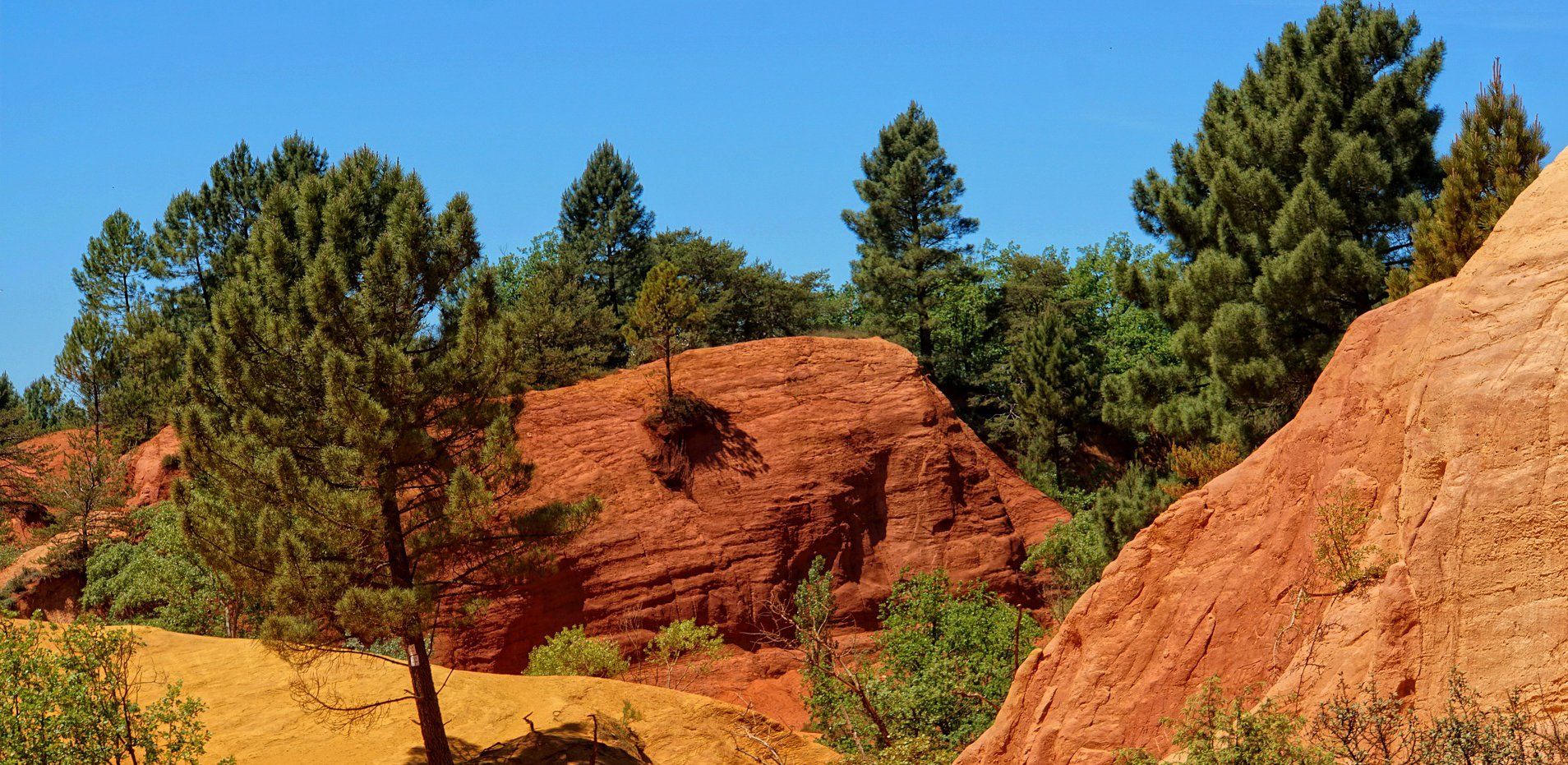 Rustrel est un site extraordinaire. Les anciennes carrières d’ocres, aux reliefs impressionnants offrant un camaïeu d’ocre sensationnel, ont des allures de canyon. Vous êtes dans le « Colorado Provençal ». Un vrai décor de carte postale avec une incroyable palette de couleurs allant du jaune au rouge vif sous le soleil éclatant et le ciel bleu de Provence. Poursuivez votre chemin de retour vers votre hôtel à travers des paysages authentiques et préservés, constitués de vignobles et de vergers.