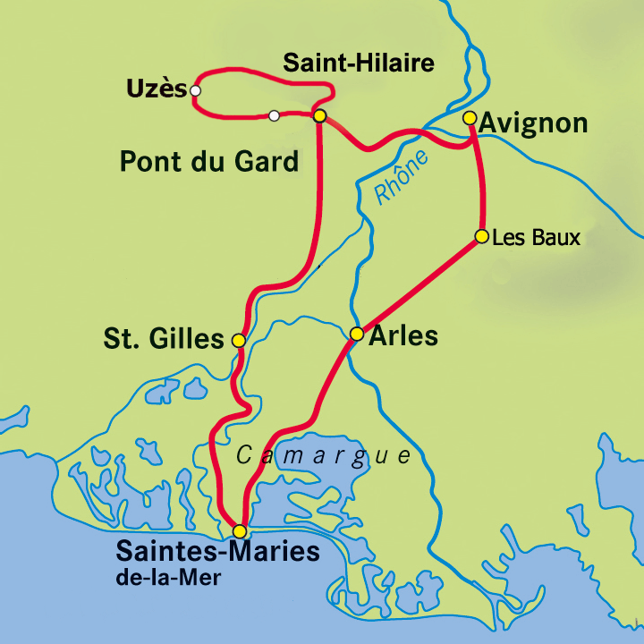 Le circuit que nous vous avons sélectionné sillonne une des plus belles régions de France. Au détour de champs d'oliviers et de lavande, il vous propose de découvrir de nombreux monuments historiques témoignant de l’époque gréco-romaine, pour la plupart inscrits au Patrimoine Mondial de l'UNESCO : Avignon avec son Palais des Papes et sa ville ancienne fortifiée, les fouilles gréco-romaines de Glanum à l'orée de Saint-Remy de Provence, Les Baux de Provence et sa cité médiévale dominant les Alpilles, Arles dont les arènes cotoîent son célèbre théâtre antique, les Saintes-Maries de la Mer et Notre-Dame-de-la-Mer, église fortifiée romane du IXe siècle, Saint-Gilles dont l'église abbatiale romane abrite une crypte mesurant plus de 50 mètres de long, le Pont du Gard, l’aqueduc le mieux conservé de l’époque romaine. Enfin, Uzès, considéré comme l’une des plus belles villes de Provence avec notamment sa Place aux Herbes...